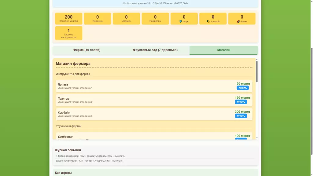 Взаимодействуйте с миром: Продавайте излишки урожая на рынке, выполняйте заказы соседей, улучшайте свои инструменты и открывайте новые редкие семена. Заведите верного питомца, который будет помогать вам!
