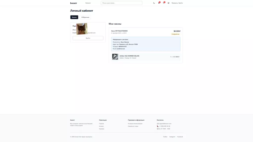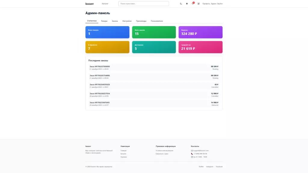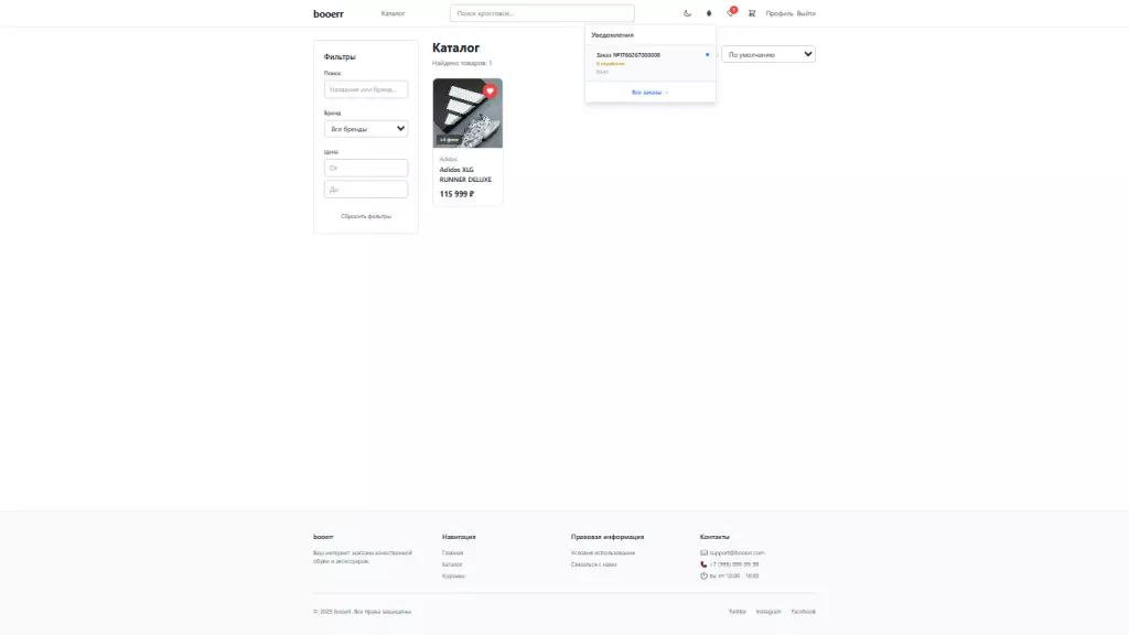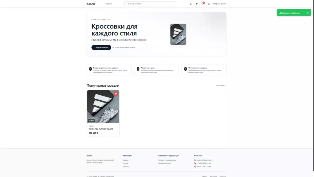 Проект представляет собой минималистичный интернет-магазин кроссовок с двумя backend-серверами на Node.js, которые обрабатывают логику работы с локальной JSON-базой данных и обеспечивают управление товарами, пользователями и заказами. Frontend создан на основе Vite v5.4.21 с использованием React 18, React Router DOM и TailwindCSS. Реализованы каталог, корзина, личный кабинет, админ-панель и переключение светлой/тёмной темы, а также поиск и фильтрация товаров.