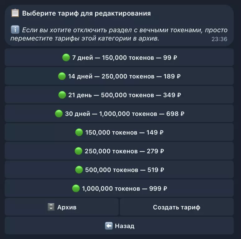 — Тарифы с пакетами токенов предоставляют доступ вашим пользователям к возможностям бота, за это они вам платят, из этого вы можете извлекать выгоду;